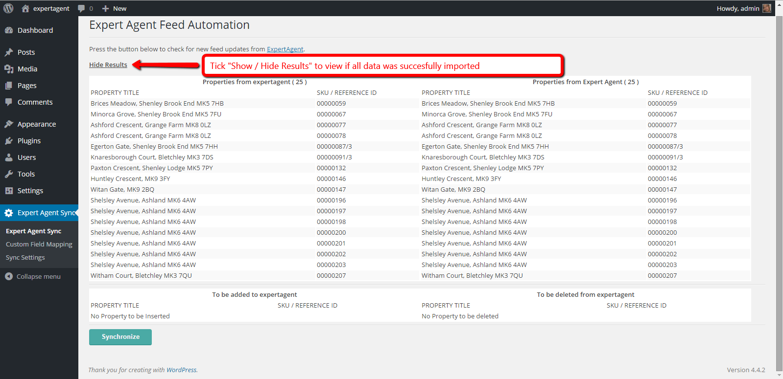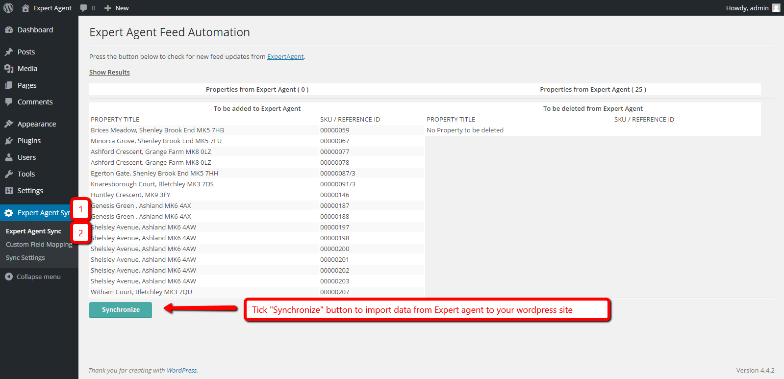 Step 5. Go to the Expert Agent Sync to import Expert Agent data to you site. Click “Synchronize” button to import data from Expert Agent to your WordPress Site.