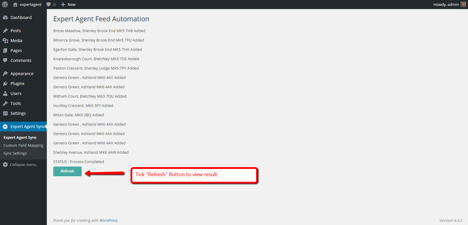 Step 6. Click the “Refresh” Refresh button to view import result and compare data with you WordPress site to your expert agent data